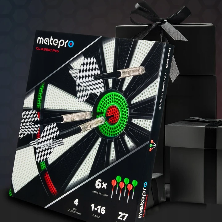 Wzmocniona konstrukcja, cztery energooszczędne wyświetlacze LED, wygłuszająca matryca oraz zintegrowane, wyjątkowo odporne lotki sprawiają, że model Classic Pro wyróżnia się na tle innych tarcz elektronicznych. Dzięki zasilaniu USB-C i możliwości gry na bateriach tarcza sprawdzi się w każdym miejscu – w domu, biurze, garażu czy podczas rodzinnych spotkań.